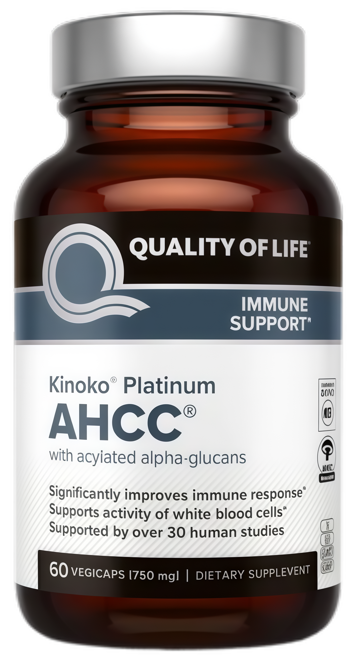 Each vegetarian capsule of Kinoko® Platinum AHCC® delivers 750 mg of AHCC®, making it easier and more convenient to achieve the 3 g daily dosage recommended during times of heightened immune challenges.